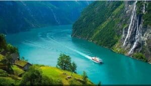 نعبر فيورد رومسدال بالعبّارة، ثم نصعد عبر جبال مكسوة بالثلوج وصولًا إلى نقطة مشاهدة “إيغل” المطلة على فيورد جيرانجر، أحد أجمل المواقع الطبيعية في العالم.